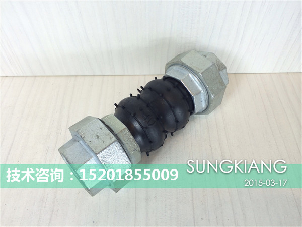 1、丝扣橡胶接头,采用天然合成橡胶生产,内加尼龙帘线,承压16kg,丝扣采用玛钢材质生产,这种产品的优点就是:减振效果比不锈钢的减振效果好30%,隔音效果比不锈钢软连接好50%,很多对环境要求高的项目都会采用橡胶软连接。缺点:安装技术要求高,补偿量小,寿命:3~5年。